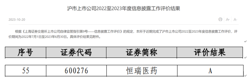近日,上海交易所公布了沪市上市公司2022-2023年度信息披露工作评价结果,凭借在信息披露、规范运作以及投资者关系管理等方面的优秀表现,PG医药获评A级。本次共有2160家沪市上市公司参评(包括499家科创板上市公司),评价等级从高到低依次为A、B、C、D四类,获得A类评价的上市公司占比约18.5%。