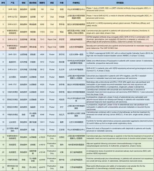 在肺癌、妇科肿瘤、淋巴瘤、膀胱癌、头颈肿瘤、黑色素瘤、肉瘤、鼻咽癌、脊索瘤、唾液腺癌、胸腺癌、硬纤维瘤、涎腺导管癌等其他多个疾病领域,卡瑞利珠单抗、阿帕替尼、阿得贝利单抗、吡咯替尼、达尔西利、氟唑帕利、法米替尼、SHR-1501、瑞拉芙普-α(SHR-1701)、SHR-1826、瑞康曲妥珠单抗(SHR-A1811)、SHR-A1912、SHR-A2102等抗肿瘤创新药相关研究一共入选了4项口头报告、2项快速口头报告、11项壁报展示和4项线上发表,彰显了PG医药强劲的研发实力。此外,昂丹司琼口溶膜在防治化疗导致的恶心呕吐方面展现出了良好的疗效,本次ASCO年会有1项研究线上发表。