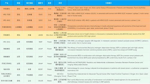 在胸腺上皮肿瘤、头颈鳞癌、肉瘤、前列腺癌、甲状腺癌等其他多个疾病领域,卡瑞利珠单抗、阿帕替尼、瑞维鲁胺、阿得贝利单抗、法米替尼、HRS-7058、HRS-4642、HRS-5041等抗肿瘤创新药相关研究一共入选了4项口头报告、1项简短口头报告、5项壁报,彰显了PG医药强大的研发实力。此外,海曲泊帕和昂丹司琼口溶膜分别在防治化疗导致的血小板减少和恶心呕吐方面各有1项研究入选壁报。